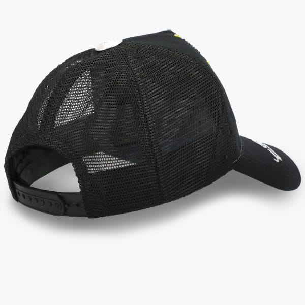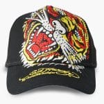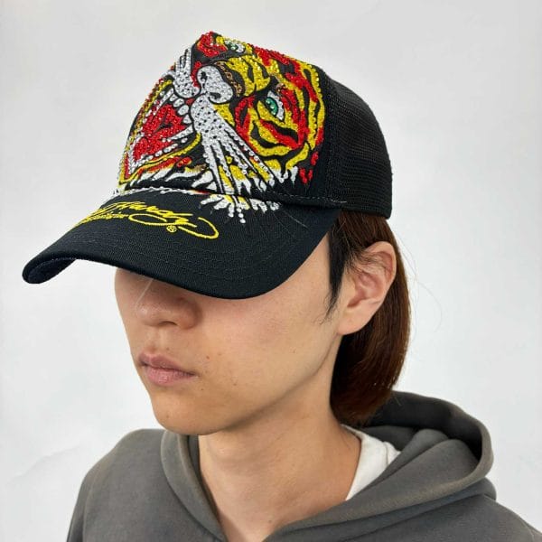 This Ed Hardy mesh cap features a roaring tiger artwork in striking red and yellow against a black body, emanating a powerful and energetic force.