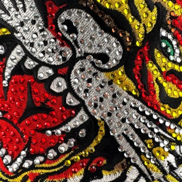 The tiger’s distinctive stripes, mouth, and fangs are densely adorned with red, yellow, and clear rhinestones. Every time it catches the sunlight or other lighting, it sparkles as if it’s alive, maximizing your street presence.