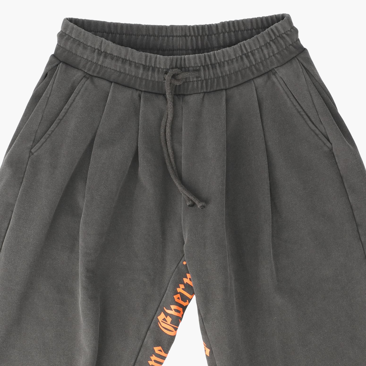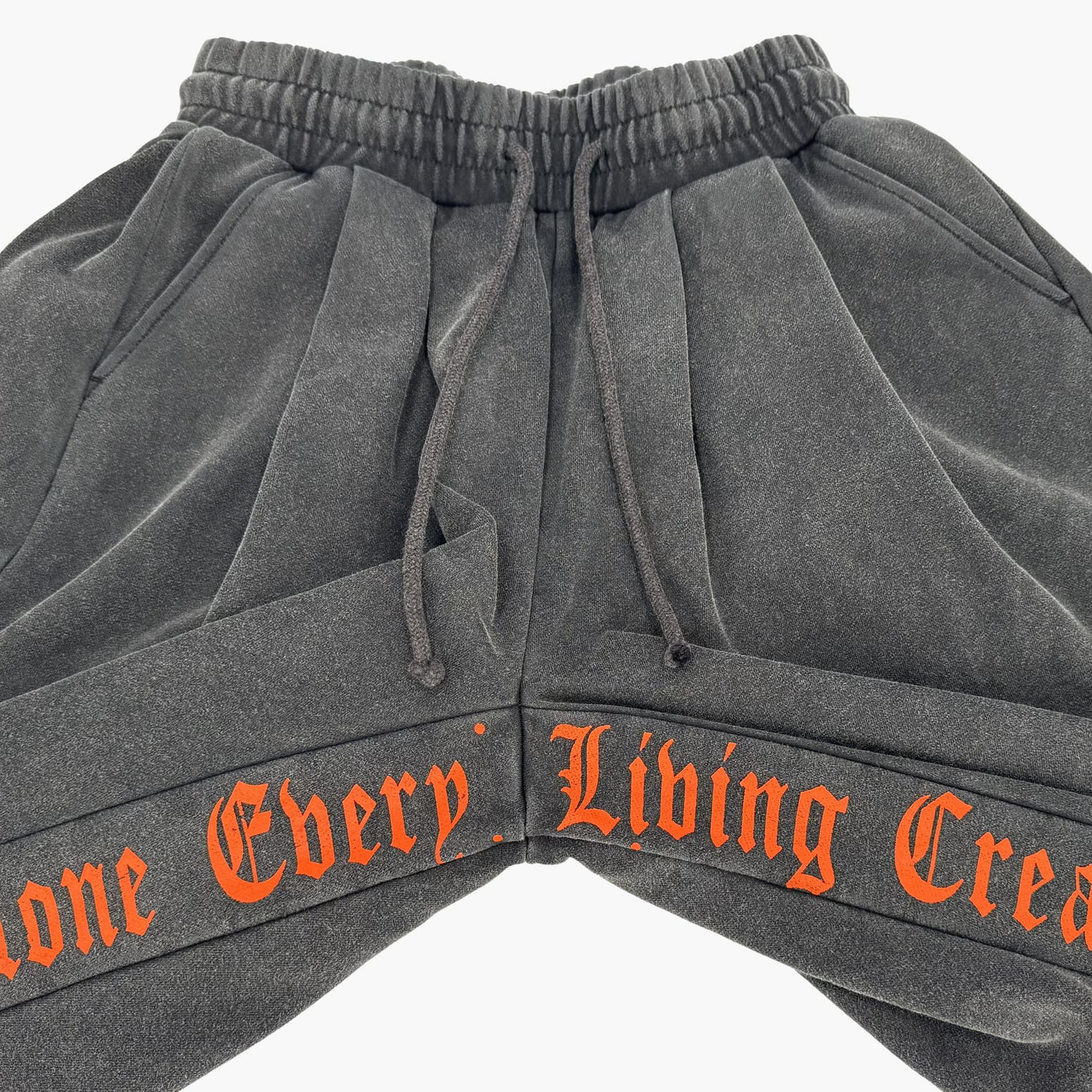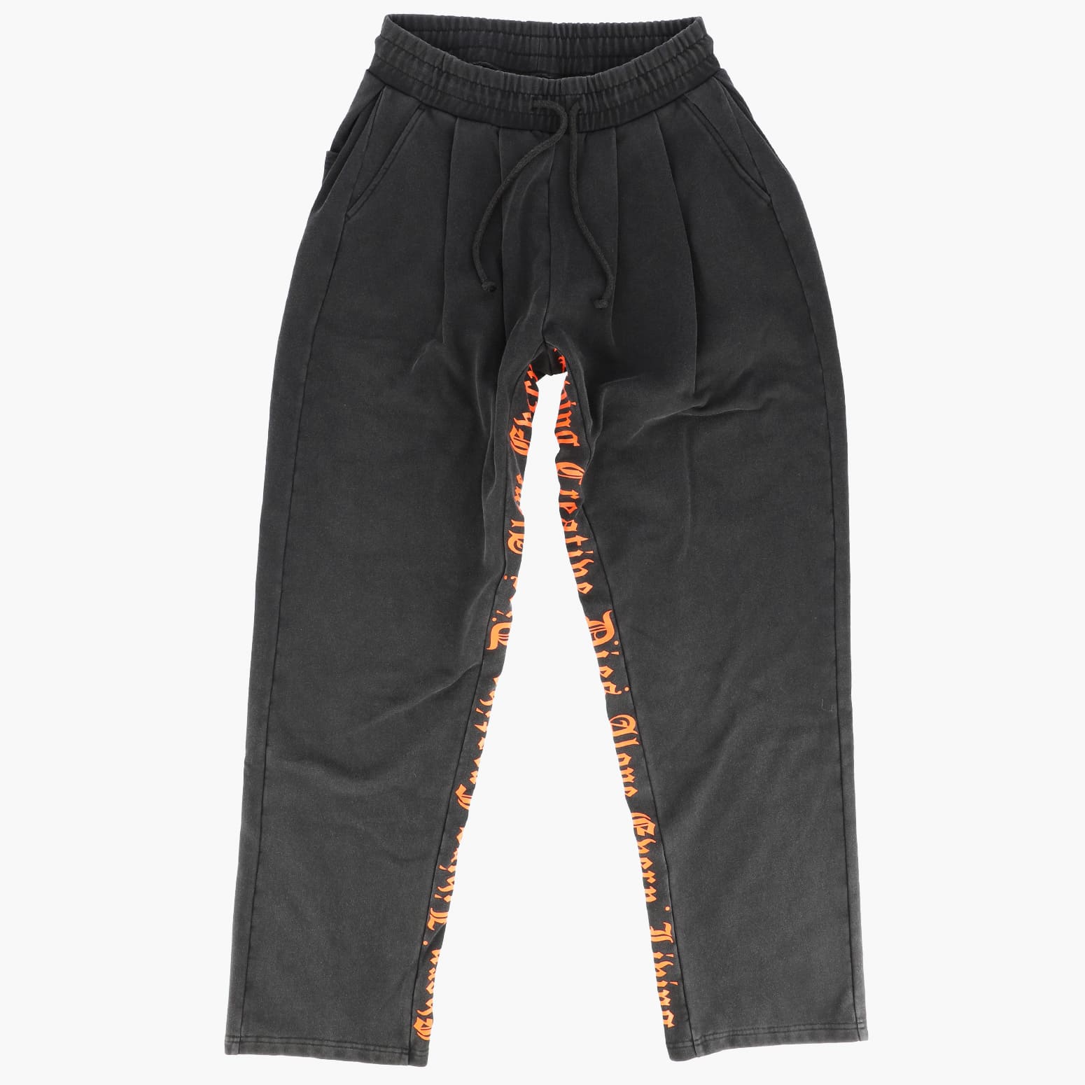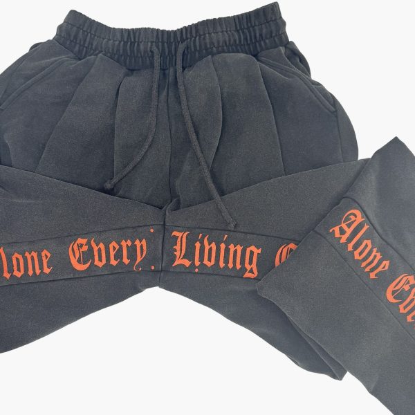 Along the inner seams of both legs, vertical gothic‑style orange text adds striking contrast against the black body, creating a simple yet powerful visual impact.